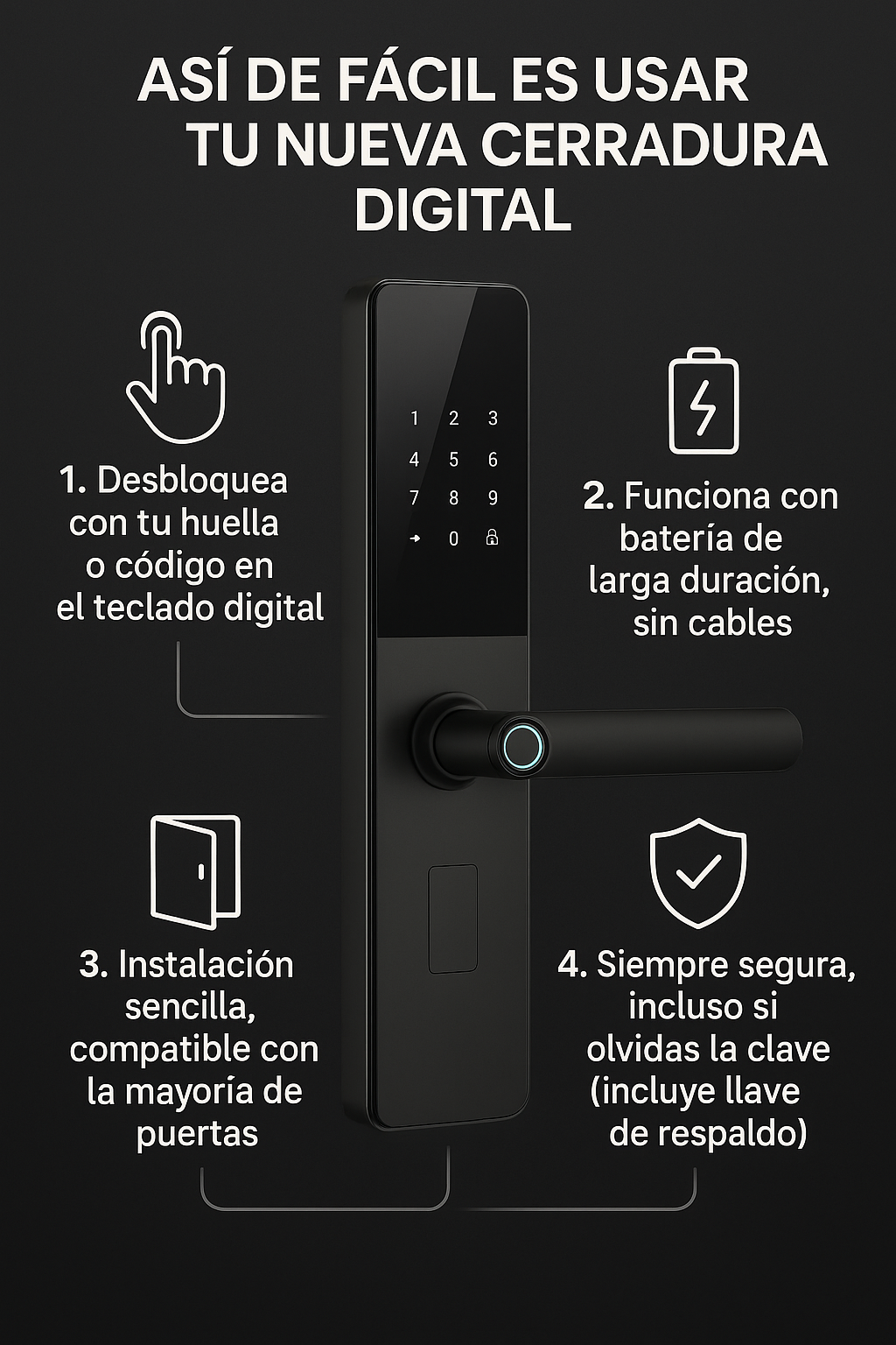💫Múltiples formas de ingreso: huella, código PIN, tarjeta magnética y llave mecánica de respaldo.